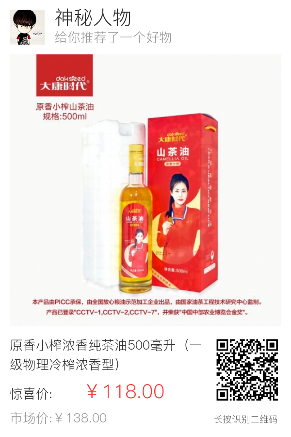 原香小榨浓香纯茶油500毫升(一级物理冷榨浓香型)