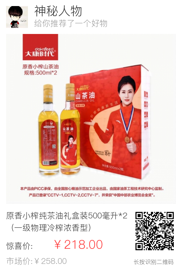 原香小榨纯茶油礼盒装500毫升*2(一级物理冷榨浓香型)